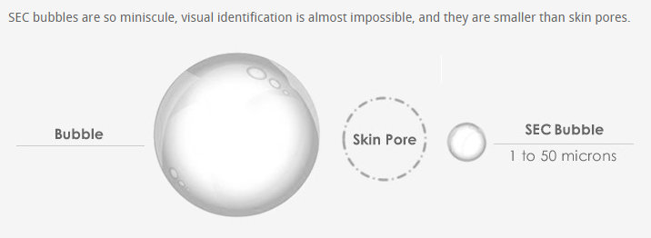 The Good News is that SEC bubbles are so small that they are smaller than skin pores and It has the ability to penetrate into clogged pores to remove the dead skin cells, bacteria and oil deposits.