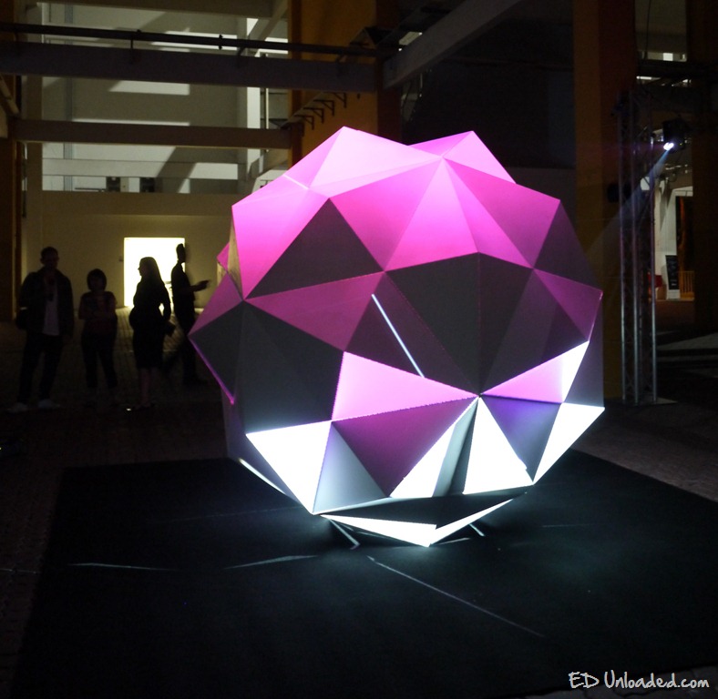 Parmenides I is a large scale geometric sculpture incorporating 360º projection mapped video. The work has been previously exhibited at the New Museum’s New Ideas for the New City Festival in New York. This sphere is a hypnotic 3D projection of swirling abstract patterns that present an amazing sense of movement, colour and form.
